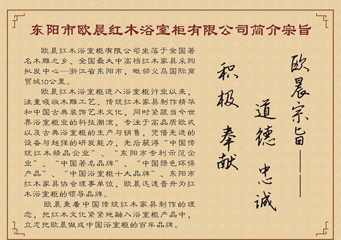 歐晨進(jìn)入浴室柜行業(yè)以來,注重吸收木雕工藝、傳統(tǒng)紅木家具制作精華和中國古典裝飾藝術(shù)文化基因,同時緊跟當(dāng)今世界浴室柜業(yè)的科技潮流,匠心制造高品質(zhì)中國傳統(tǒng)古典中式、新中式、歐式、美式浴室柜的設(shè)計生產(chǎn)與銷售,憑借專業(yè)的超強研發(fā)能力。